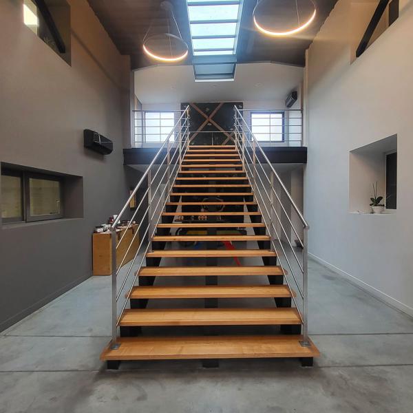 Espacio singular de 100 m2 distribuidos en dos plantas creado con materiales varios, hierro, cristal y madera trabajada con formato cúbico. Negro, blanco, minimalista y cálido a la vez.
